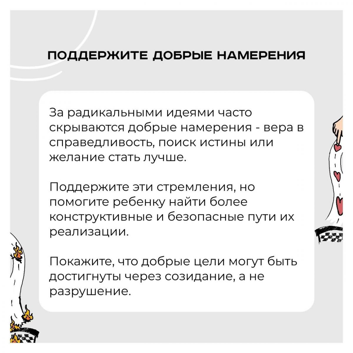 Если вы заметили, что ваш ребенок увлекся радикальными идеями, важно действовать осознанно и аккуратно.Человеческий мозг склонен упрощать сложные проблемы, что порой приводит к радикализации. Но этот процесс важно признать и преодолеть.Предлагаем несколько советов, как действовать в случае радикализации вашего воспитанника: