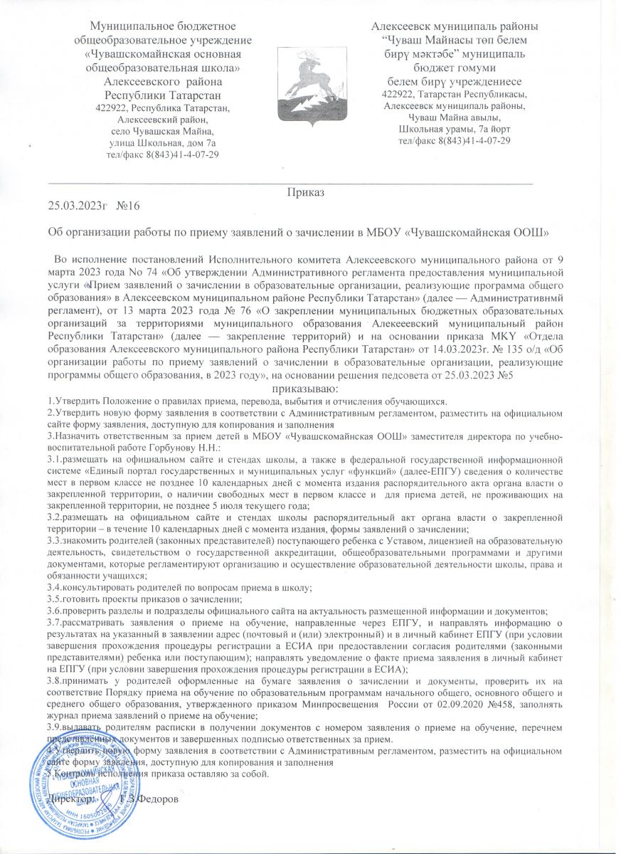 Приказ об оргазации по приему в школу