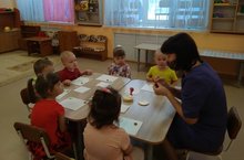 Педагог продолжала обучать детей отрывать маленькие кусочки пластилина, скатывать их между ладошками.