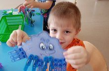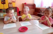 Педагог обучала детей отщипывать кусочки пластилина и прикреплять к основе, надавливать указательным пальцем на пластилиновый шарик.