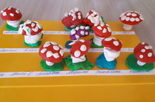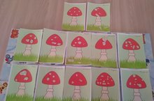 Педагог обучала детей лепке мухомора их четырёх частей (шляпка, ножка, "юбочка", полянка). Показала ребятам рациональный способ изготовления крапинок (украшение) для шляпки: раскатывание жгутика и разрезание стекой на мелкие кусочки.