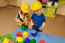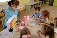На занятии педагог учила детей различать предметы по форме и называть их: кубик, кирпичик, шарик; совершенствовали действия с данными предметами.