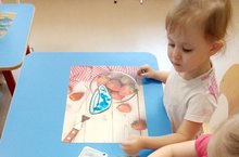 Дети учились на занятии рисовать пальчиком, стараясь равномерно расположить рисунок (горшки) внутри контура.