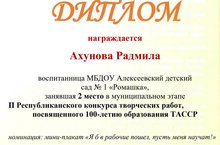 Воспитанница старшей группы нашего детского сада Ахунова Радмила заняла 2 место в муниципальном этапе Республиканского конкурса творческих работ«Рабочей профессией славится мой Татарстан!», посвящённого 100- летию образования ТАССР, в номинации: мини - плакат "Я б в рабочие пошёл, пусть меня научат!" Поздравляем!