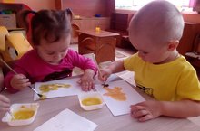 Дети учились рисовать осенние листочки пальчиками-окунали в краску кончики пальцев и ставили на бумаге одно и двуцветные отпечатки. Пальчиковый метод рисования вызвал у детей интерес к созданию коллективной композиции "Листопад". Вот такая осенняя картинка у нас получилась.