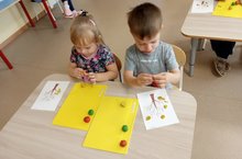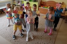 На занятии дети познакомились с числом и цифрой 2. Малыши составляли из частей в целое "листок". Учились рисовать прямые короткие линии.