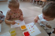 Педагог учила детей держать кисть, окунать в краску полным ворсом, различать цвет.