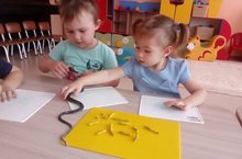 В ходе занятия дети учились раскатывать валик (колбаску) из платилина. Развивали мелькую моторику.