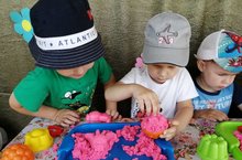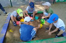 Летом на прогулке в садике дети играют с песком, качаются на качелях, рассматривают насекомых, рисуют, играют с лего.