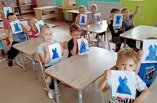 Рисование кистью на тему "Синий сарафан для козы". На занятии дети закрепили навыки работы с красками. Педагог прививала ребятам бережное отношение к своей работе, желание помочь козе при выборе цвета сарафана.