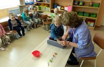 Дети 1 группы раннего возраста закрепили содержание сказки "Курочка - ряба". Детки включались в элементы. А в конце представилась возможность побывать поближе с героями сказки. Кто то охотно "шёл на сближение", а кто то осторожничал и это вполне объяснимо для этого возраста. Дети остались в хороших впечатлениях. Сказка уложилась в памяти малышей... А впереди ещё МНОГО сказок ждёт ребят.