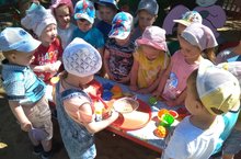 Воспитатель провела с детьми игры с песком на свежем воздухе с целью знакомства с особенностями сухого и мокрого песка и формирования представления об изменчивости формы песка в зависимости от формочки. Во время игр у ребят развивалась речь и мелкая моторика.