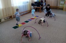 Занимательная физкультура прошла у малышей с комплексом ОРУ "Мы силачи", прыжками с продвижением вперёд через препятствия, ползанием под дугами, ходьбой по дорожке с коррекцией стопы и подвижной игрой "Кот и мыши".