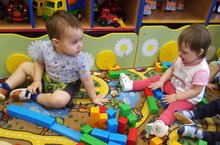 Воспитатель развивала у детей умение различать цвета красный, жёлтый, зелёный и синий, а также мелкую моторику рук.