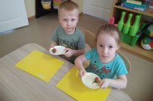 Воспитатель формировала у детей представление о фруктах, как витаминах, полезных для здоровья. Развивала умение детей лепить яблочки, раскатывать пластилин круговыми движениями.
