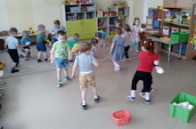 Воспитатель провела в группе с детьми игры: «Попади снежком в цель (ящики)»; «Собери снег и снежки (девочки собирали снег, а мальчики снежки)». Дети прыгали с льдины на льдину, а также познакомились со спортивным инвентарём: клюшкой и шайбой, каждый из детей попробовал забить клюшкой шайбу в ворота.