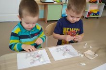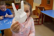 Под руководством воспитателя дети изготовили поделку из бумажных ладошек "Зайка" . При этом они закрепляли умение обводить свою ладошку, аккуратно вырезать нарисованное точно по линии, а также развивали творческие способности.