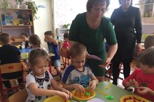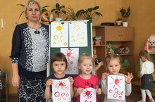 Сегодня дети младшей группы с воспитателем Минеевой Л.В. рисовали ватными палочками веселое солнышко, играющее с колечками. Цель занятия - показать сходство и различие мужду кругом и кольцом, упражнять детей в рисовании свободно двигать ватной палочкой по окружности и в разных направлениях, а так же развивать чувство формы и цвета.