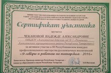 Воспитатель Чеканова Н.А. приняла участие в Республиканском конкурсе профессионального мастерства русскоязычных воспитателей "Я говорю и работаю на татарском языке - 2016". Надежда Александровна заняла 1 местов муниципальном этапе, а на уровне Республики ей вручили сертификат участника. Искренне ее поздравляем и желаем дальнейших творческих успехов и побед!!!