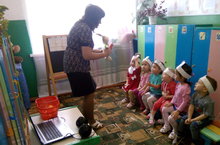 В первой младшей группе дети изучают родной язык (Гатина Г.Г.). К ним в гости пришел зайчик, поиграл с ними в игру "Собирай морковку", смотрели анимационный сюжет. Дети спели для зайчика песенку "Ак куян" (Белый заяц). Малышам очень нравится занятия, они с удовольствием поют песенки, играют и учатся говорить на родном языке.