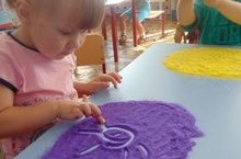 Рисование песком – новый вид изобразительной деятельности дошкольников. Ведь рисовать любят все дети, а таким необычным способом особенно. Ребята младшей группы, под руководством воспитателя Талалаевой Т.Л, с увлечением рисовали пальчиками по разноцветному песку. Работы получились очень яркими и интересными.