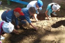 Юные художники подготовительной группы, сегодня рисуют не на бумаге. Посмотрите, оказывается и мокрый песок годится для творчества, нужно только постараться и найти подходящую палочку вместо кисти и карандаша! И вот из под рук художников ярко светит летнее солнце, вырастают высокие многоэтажки, расцветают цветы и садятся на них веселые бабаочки.