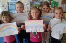 В день радуги, дети младшей группы с помощью воспитателя Талалаевой Т.Л., нарисовали радугу -дугу после дождя. Ребята закрепили названия цветов, постарались раскрасить радугу не выходя за контур.