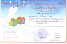 Подведены итоги Республиканской интеллектуальной олимпиады для дошкольников "УМКА", организованной Центром для одаренных детей г. Нижнекамска. В данном мероприятии приняли активное участие воспитанники подготовительной группы нашего детского сада и получили хорошие результаты: