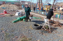 Весенняя погода наконец то стала радовать нас солнышком. А в детском саду началась уборка территории.