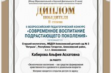 По итогам II Всероссийского педагогического конкурса "Современное воспитание подрастающего поколения", старший воспитатель Кабирова А.А. заняла 2 место. В конкурсе участвовала статья на тему: "Экологическое воспитание - как средство формирования нравственности и духовности в дошкольном возрасте". Поздравляем.
