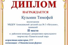 По итогам Районного конкурса декоративно-прикладного творчества "Удивительный мир", воспитанник Кузьмин Т. занял 2 место, руководитель Трифонова Т.В. Поздравляем педагога и воспитанника.