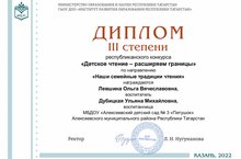 По итогам Республиканского конкурса "Детское чтение - расширяем границы", воспитаница Дубицкая У. заняла 3 место, в номинации "Наши семейные традиции чтения", руководитель Левшина О.В. Поздравляем педагога и воспитанницу.