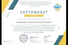 7 декабря 2022г. в рамках международной программы "Эко-школа/Зеленый флаг" , в г. Набережные Челны прошел Республиканский семинар-практикум "Творчество педагогов в создании развивающей среды ДОУ из вторсырья", на данном семинаре были подведены итого Республиканского конкурса авторских дидактических игр из бросового материала "Экофентази". Воспитатель Трифонова Т.В. стала победителем конкурса. Поздравляем.