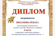 10 декабря 2022г. были подведены итоги Районного творческого конкурса "Соломенныйбычок да лыковый лапоток.." Воспитанница Низамова Р заняла 1 место, руководители Ситдикова Р.Р., Фомина Н.А. Поздравляем педагогов и воспитанницу.