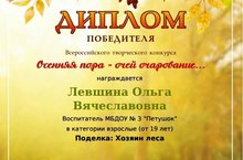 15 ноября 2022г., воспитатель Левшина О.В. стала победителем Всероссийского творческого конкурса "Осенняя пора - очей очарование..." Поздравляем педагога с победой. Желаем творческих успехов.