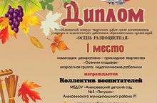 Подведены итоги республиканского конкурса творческих работ среди воспитанников, учащихся и педагогических работников образовательных организаций "Осень разноцветная". Педагогический коллектив занял 1 место в номинации декоративно-прикладное творчество "Осенняя кладовая". Поздравляем с победой.
