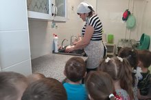 Чунина Т.Ю., провела с ребятами младшей группы занятие по ознакомлению с посудой. Все вместе они разобрались, какие бывают тарелочки, для чего они используются. Определили, чем бокал отличается от стакана, а младший воспитатель группы, Косова И., показала малышам, как она ухаживает за посудой. Как моет чашечки и тарелки, как раскладывает их в сушилке.
