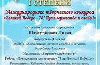 Воспитанники подготовительной к школе группы, под руководством их воспитателя, Кабировой А.А., приняли участие в международном конкурсе чтецов "Великой Победе - 75! Путь мужества и славы!" и заняли призовые места. Диплом 3 степени получил Бакова Олеся и Корнева Екатерина, Макаев Самат, получил диплом 2 степени, а Шайхутдинова Лиля заняла 1 место.