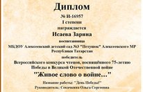 Подведены итоги 2 этапа Всеросийского конкурса чтецов "Живое слово о войне...". Всего в конкурсе приняло участие 2000 человек из 56 регионов РФ. Воспитанница средней группы нашего детского сада, Исаева Зарина, тоже приняла участие в этом конкурсе и заняла первое место. Поздравляем Зарину и ее педагога, Секачкину О.С. с победой. Молодцы!!!