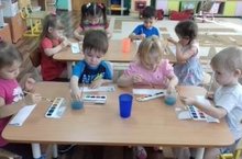 В рамках тематической недели " Я и моя семья" дети младшей группы " Пчелки" рисовали "Полосатые полотенца". Воспитатель Гервасьева Т.Ю. обучала детей рисовать прямые и волнистые линии на длинном прямоугольнике, совершенствовала технику рисования кистью.