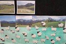 На тематической неделе "Дикие и домашние животные" дети подготовительной группы выполняли аппликацию "Овечки на пастбище".