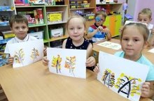 Дети старшей группы №2 учились сочетать разные изобразительные техники для передачи характерных особенностей золотой кроны (аппликация) и стройного ствола с ветками (рисование).