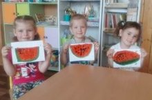 Август — арбузный сезон. Очередной тематический день посвящен этой большой и вкусной ягоде. Воспитанники младшей группы "Смешарики" рисовали арбузную дольку.