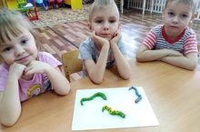 На занятии по лепке педаог Синякова Е.Е. закрепляла у детей умение раскатывать из пластилина длинную "колбаску", зауженную к низу, продолжала обучать украшать изделие.