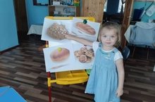 В рамках тематической недели "Осенние дары" воспитатель младшей группы "Смешарики" Веретенникова С.А. познакомила детей с хлебобулочными изделиями, обучила различать и называть существенные признаки и качества изделий. Ввела в словарь такие слова , как каравай, буханку, булка, пышка.