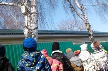 Дети средней группы "Солнечные зайчики" гуляют, да приссматриваются. Рассматривают скворечники, которые они смастерили с папами. Каждый искал свой домик. Определяли, не поселились ли жильцы?