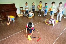 Воспитанники старшей группы "Цыплята" учатся ходить по канату приставным шагом.