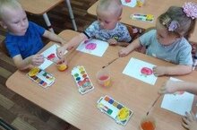 Воспитатель Сарапкина И.Н. обучала детей создавать в рисунке композицию из 2-3 элементов разной формы, способствовала развитию чувства цвета, формы и композиции.