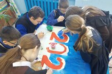 Юные журналисты работают над новогодним выпуском газеты.