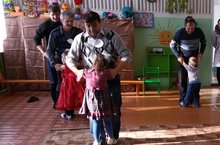 Бүген әтиләр белән." - мәктәпкәчә балалар төркемендә үткән бүгенге бәйрәмебез менә нундый матур сүзләр белән башланып китте. Балалар этиләрен җыр-биюләр, тәбрикләү сүзләре, үзләре ясаган открыткалар белән шатландырды. Бәйрәмнең икенче өлешендә әтиләр һәм балалар ике комндага бүленеп төрле ярышларда көч сынашты.